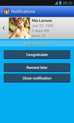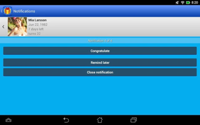 Pridanie novej udalosti, či už narodenín alebo výročia, trvá len pár sekúnd. Zadajte informácie raz a využívajte ich po celé roky. Tento osobný asistent bude pracovať za vás, presne podľa vašich predstáv a nič viac. Nastavte si vlastné upozornenia a pripomienky, aby ste už nikdy nezabudli na žiadnu dôležitú udalosť. Nechajte si pripomenúť v deň udalosti vo vami zvolenom čase, alebo dokonca niekoľko dní vopred, ak potrebujete čas na prípravu prekvapenia, nákup darčeka či naplánovanie stretnutia. Priamo z aplikácie môžete navyše jednoducho poslať srdečné blahoželania prostredníctvom hovoru, SMS správy, e-mailu alebo obľúbenej chatovacej aplikácie.