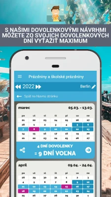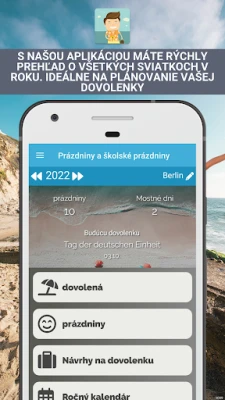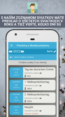 S aplikáciou Sviatky a sviatky získate prehľad o takzvaných premostených dňoch, ktoré inteligentne spájajú sviatky s víkendmi, čím minimalizujete potrebu čerpania dovolenky. Ponúkame vám šikovné návrhy, koľko dovolenkových dní je potrebné na vytvorenie ideálneho predĺženého voľna. Celoročný kalendár prehľadne zobrazuje všetky štátne sviatky, školské prázdniny a premostené dni spolu s odporúčaniami na dovolenky, všetko na jednom mieste. Navyše, aplikácia Sviatky a sviatky vás vopred bezplatne upozorní na blížiace sa sviatky či prázdniny, pričom si sami určíte dobu predstihu upozornenia, alebo túto funkciu jednoducho vypnete, ak ju nepotrebujete.